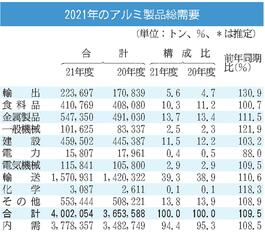 21年のアルミ製品総需要/車向け回復/1割増、400万トン