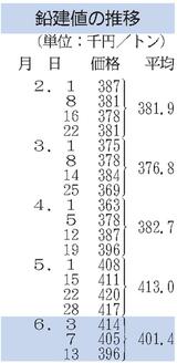 三菱マテ、鉛建値9000円下げ/1カ月半ぶり40万円割れ